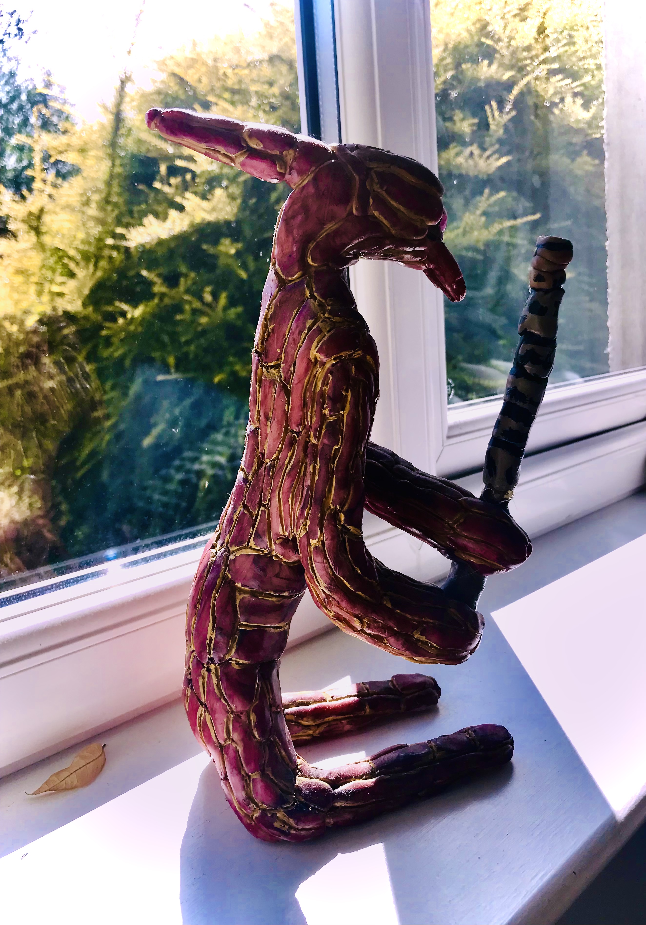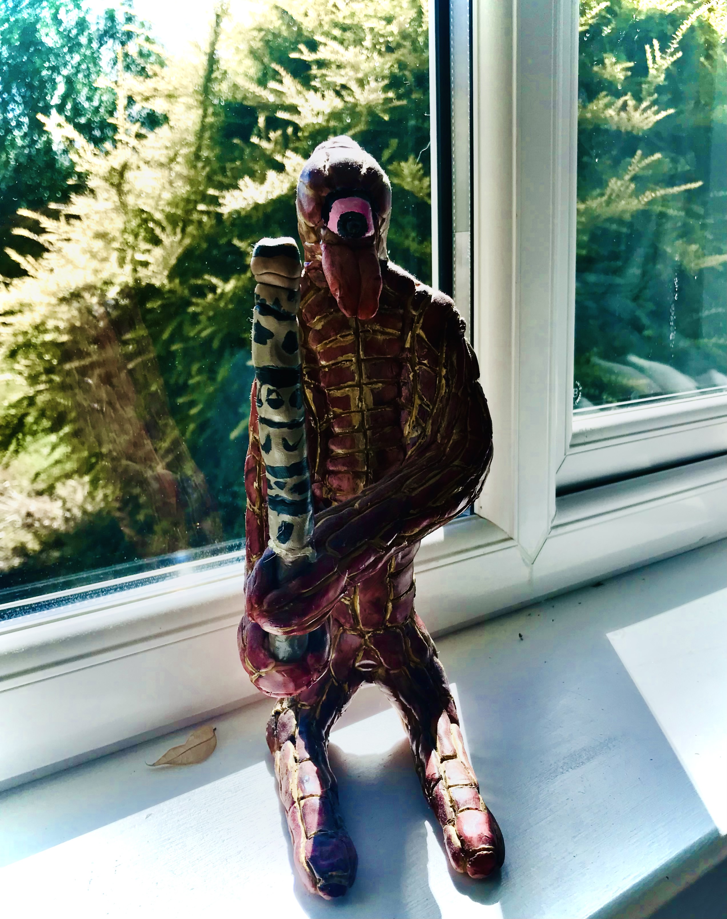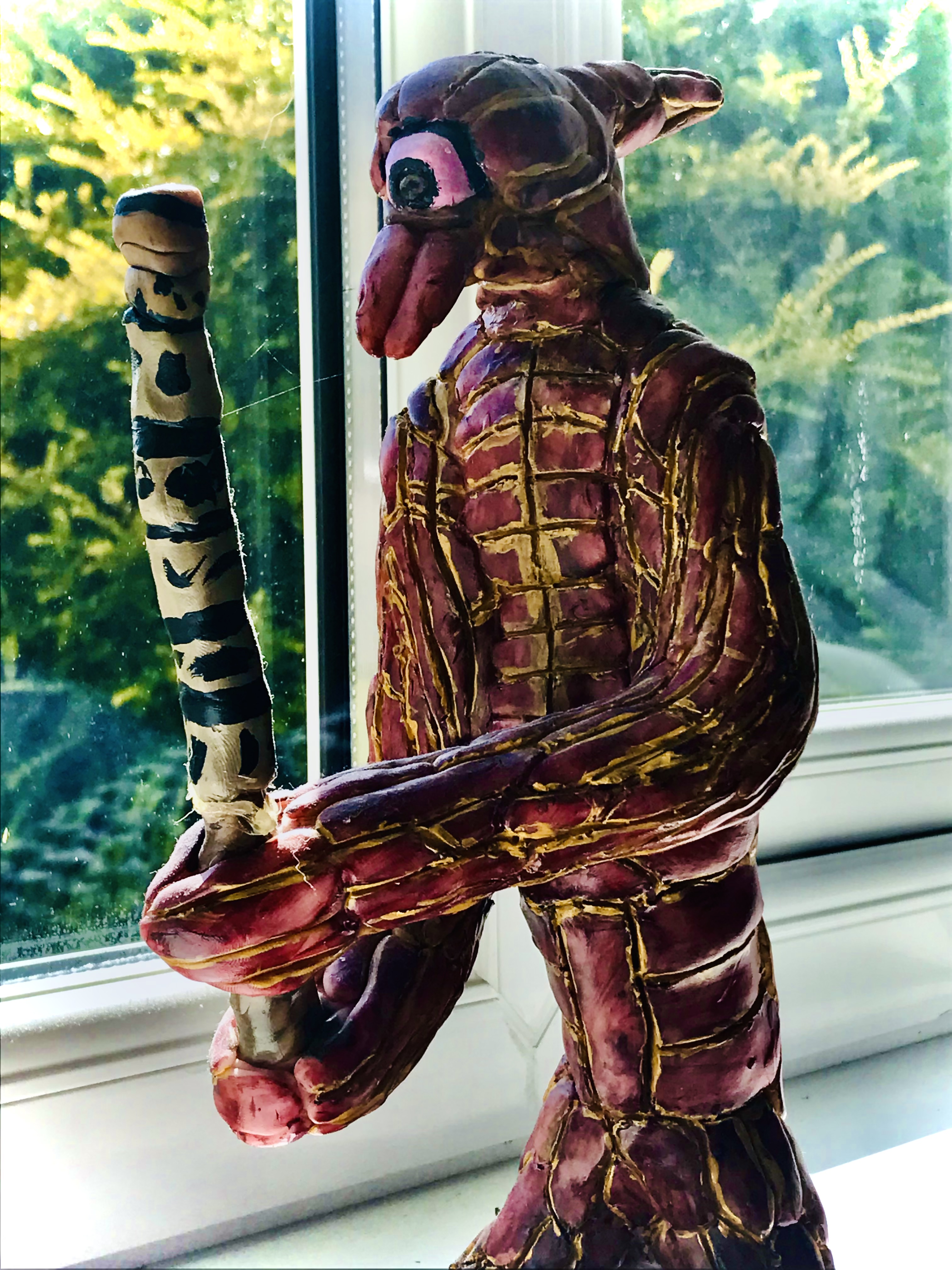 This model is a ‘Yuzzik with Club’ part of the ‘Created Genes’ project which Scott has been developing for a number of years. This is one of the first models which Scott completed during the early lockdown period of Spring 2020. The original design was part of an experiment to show how a Yuzzik might interact with the world around it, in particular with an object it may handle. The club which this Yuzzik is holding is intended as both a weapon and a tool. This model is made of modelling clay, it has a wire skeleton and was finished in the oven; it was then painted using acrylic paints.