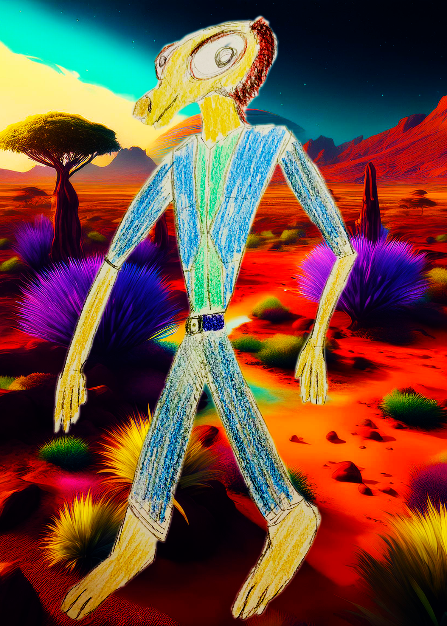 In the alternate images of Karyuxad, different colour filters were used to enhance Scott’s original design, and using Photoshop’s internal AI image generator background images were added to the final two images to reflect the terrain you might find Karyuxad in, as an ocean dweller Karyuxad evolved in an underwater, ocean landscape.