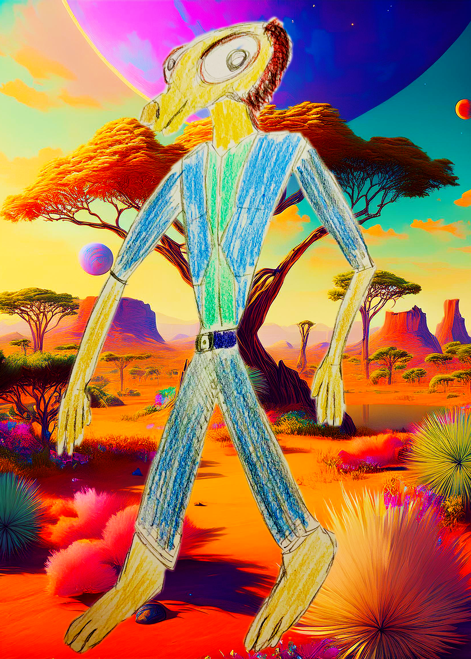 ‘Cleoban’ is a character development sketch using a creature from one of Scott’s current projects the ‘IALFEC‘ universe. Cleoban is a concept for a new character, in this study Scott has been considering what characters and creatures might look like if it had evolved as sentient creatures that lived within a dry alien savannah. This design is related to the other mammalian characters which Scott has developed, and is related in particular to ‘Ralten‘.