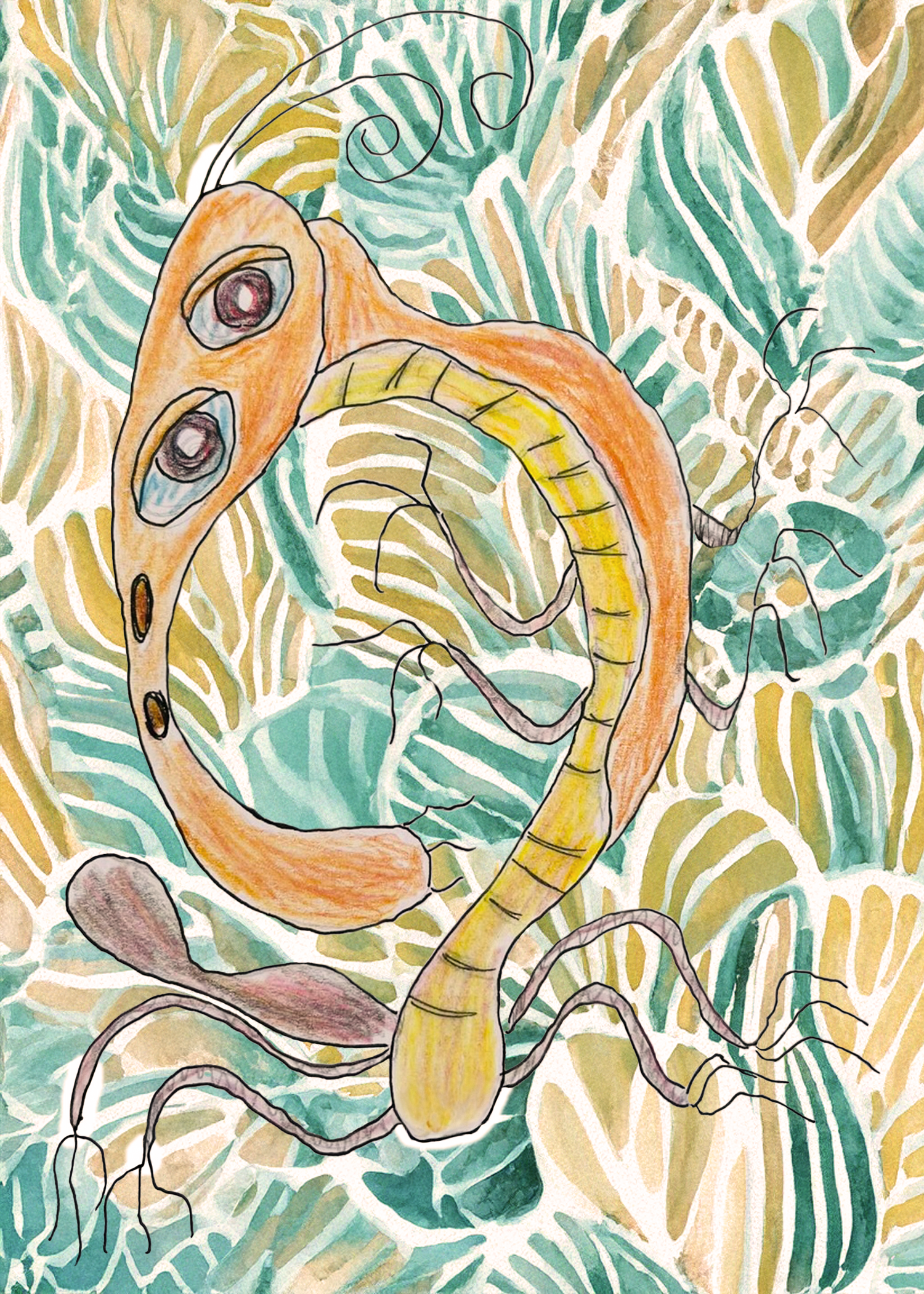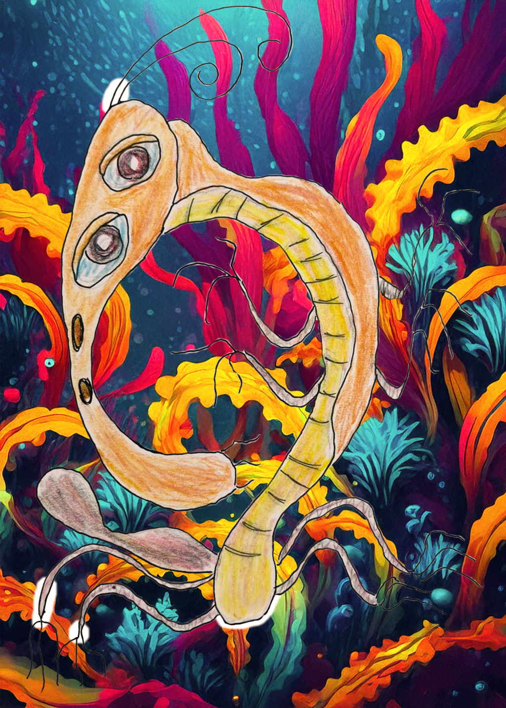 In the alternate images of Pylrcon, different colour filters were used to enhance Scott’s original design, and using Photoshop’s internal AI image generator background images were added to give Pylrcon a terrain that seemed to fit their character.