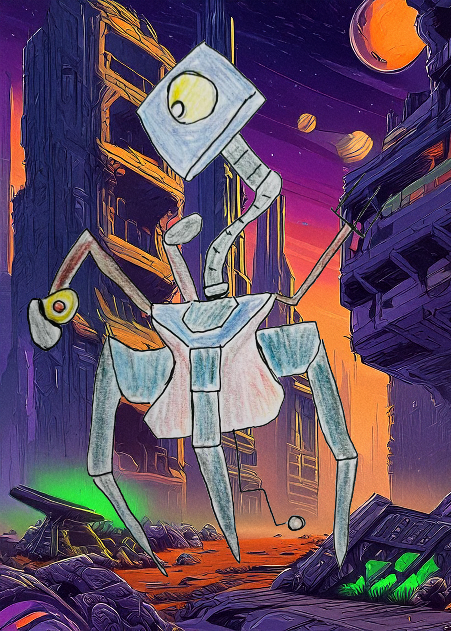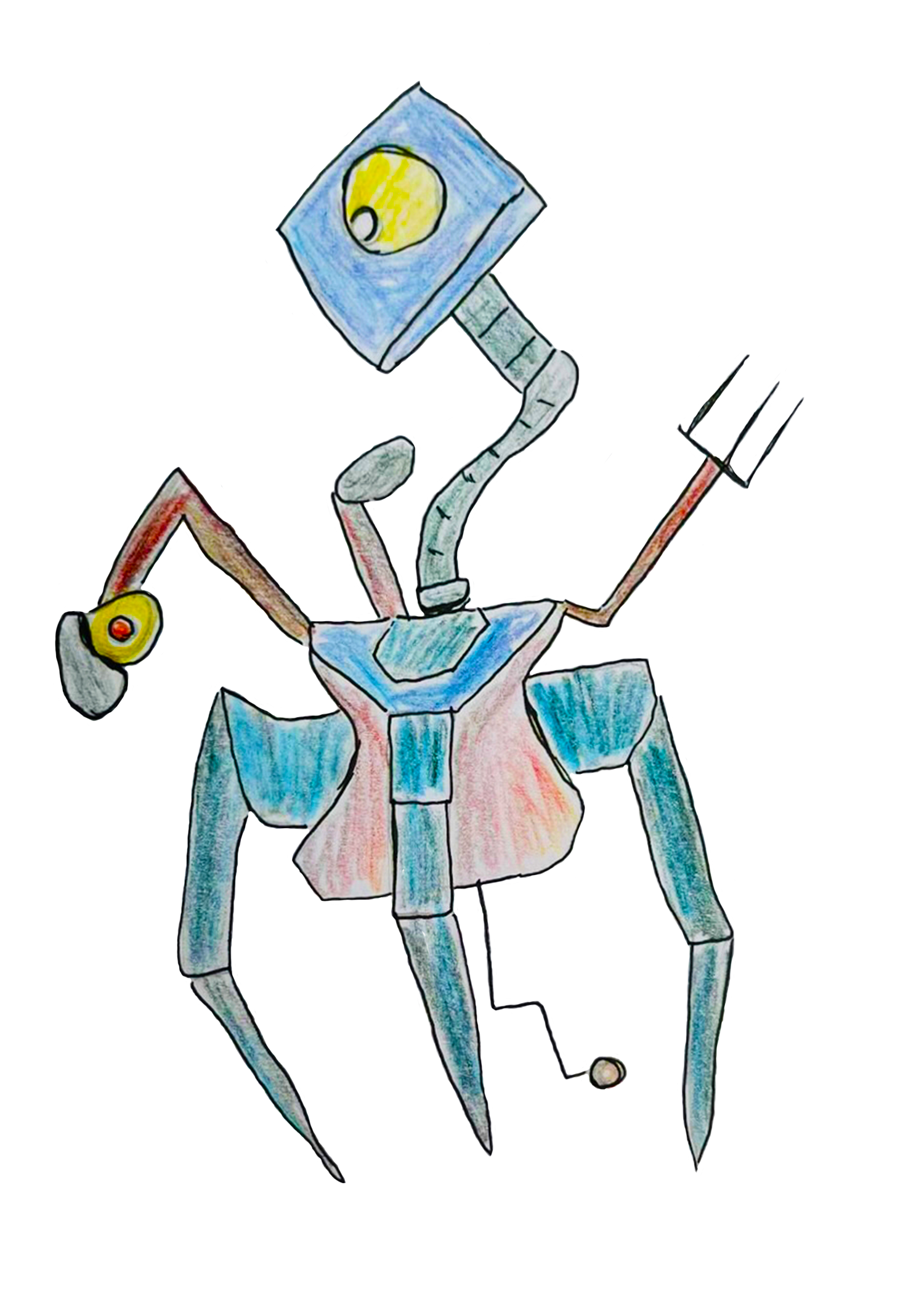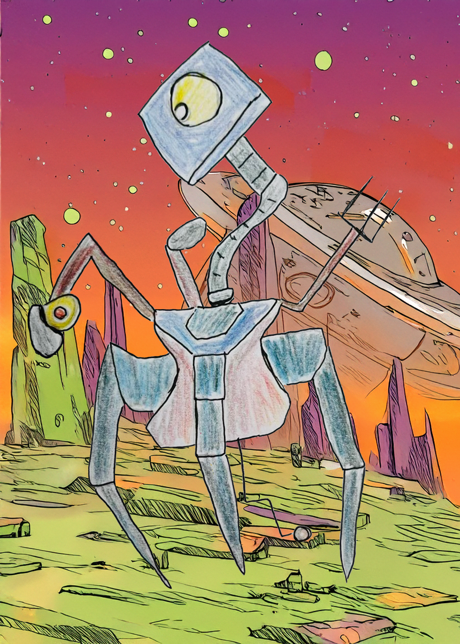 ‘Sentachhu’ is a character development sketch of a creature designed for one of Scott’s current projects the ‘IALFEC‘ universe. Sentachhu is a sentient mechanoid creature that may appear in some of Scott’s planned animated stories, but for now Sentachhu has been placed in on alien planet destroyed by an unknown disaster. As a mechanoid creature, Sentachhu’s metallic body is perfectly designed to explore the harsh and ruinous world on which Scott sees this creature belonging to.