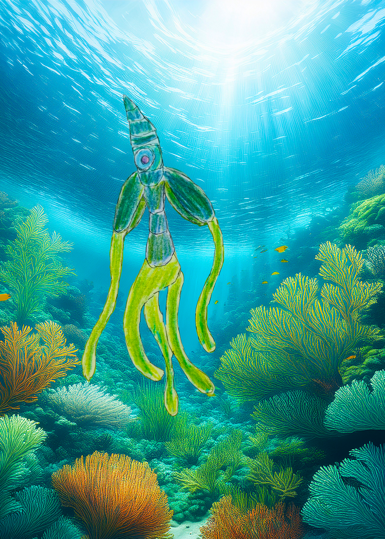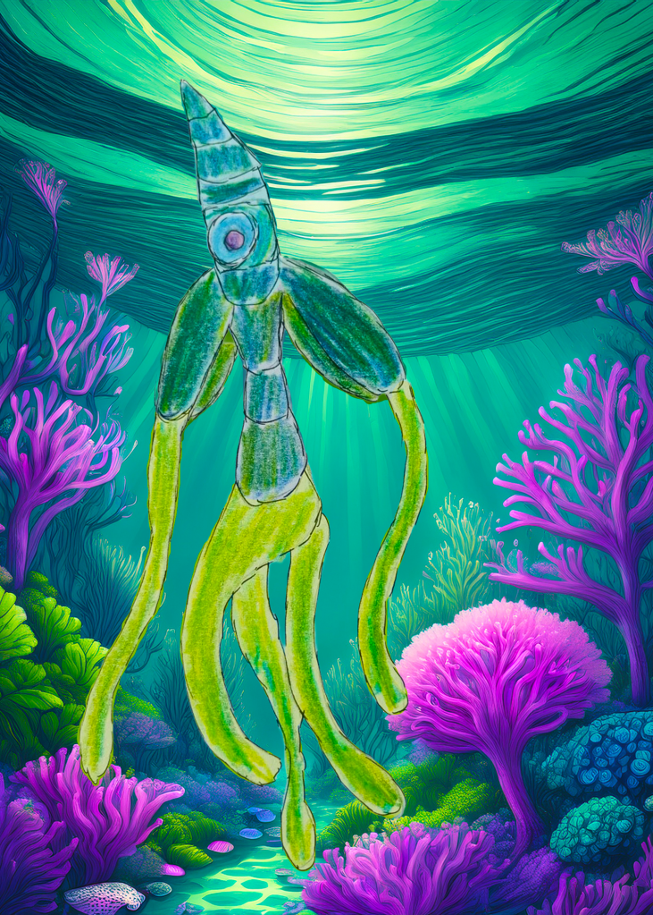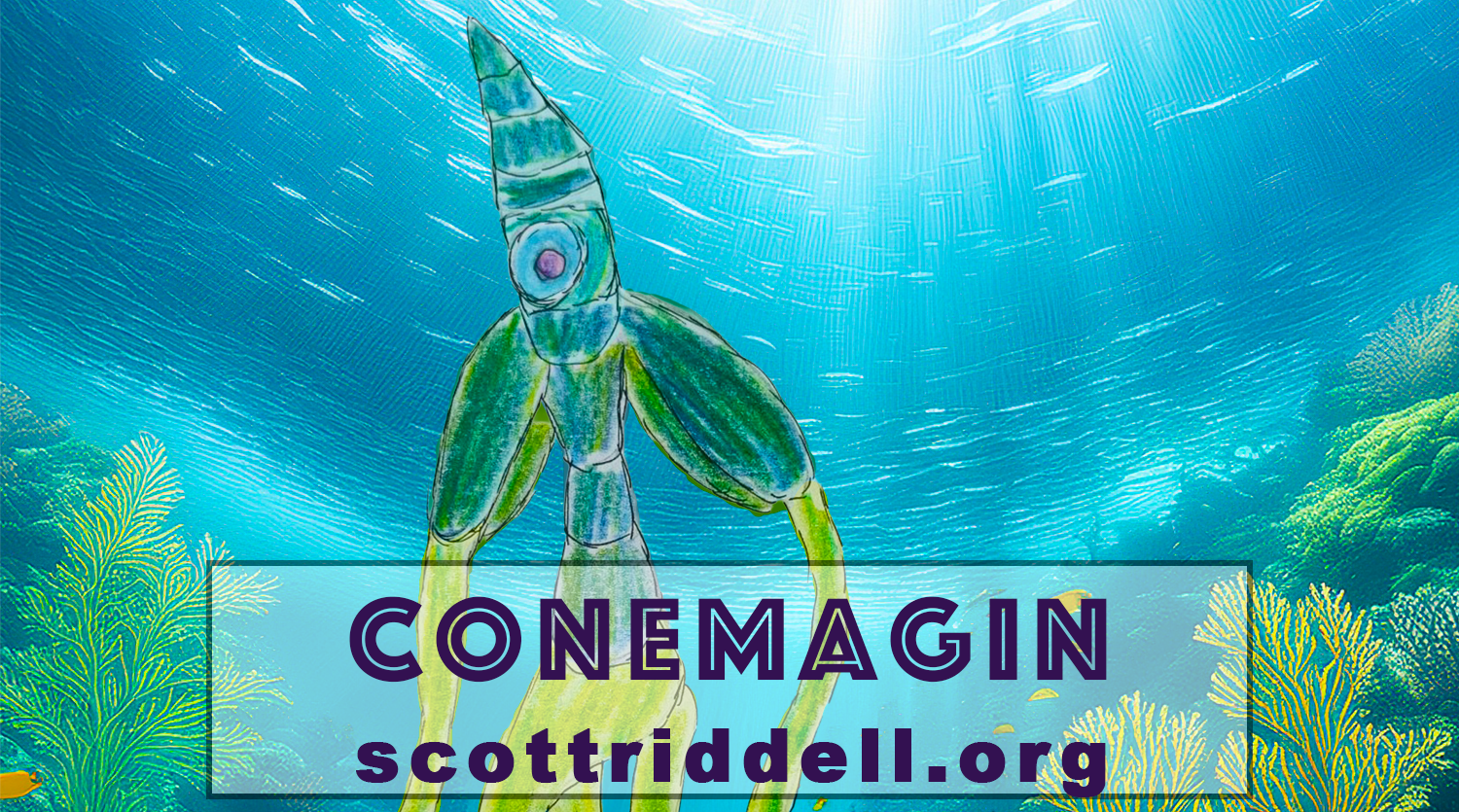 The Conemagin (pronounced cone-ma-gene) is a creature that Scott designed in late 2025. The Conemagin is an aquatic animal which lives entirely underwater. It is similar to a gastropod, and is very intelligent, agile, and is able to manipulate objects and use them as tools. Like an Octopus on earth, the Conemagin is a skilled underwater hunter, it can be fierce, but is more likely to drift on the current snaring passing aquatic life as it drifts by.